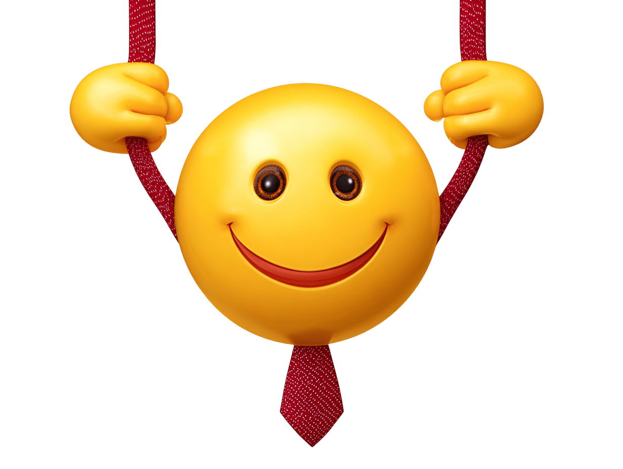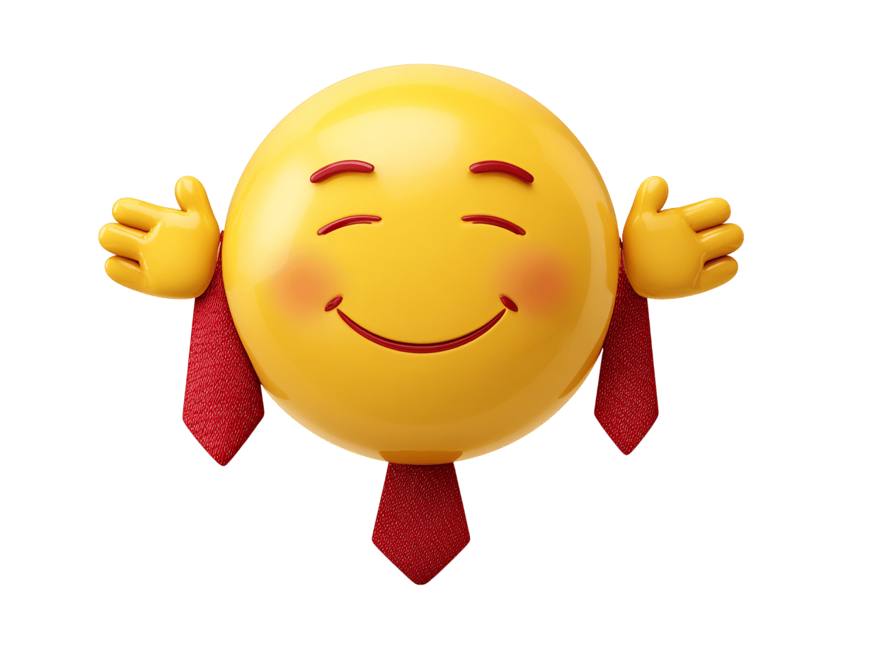 Smiling yellow emoji with hands and red tie