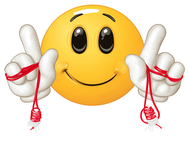 Smiling emoji with hands holding red and white threads