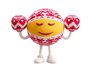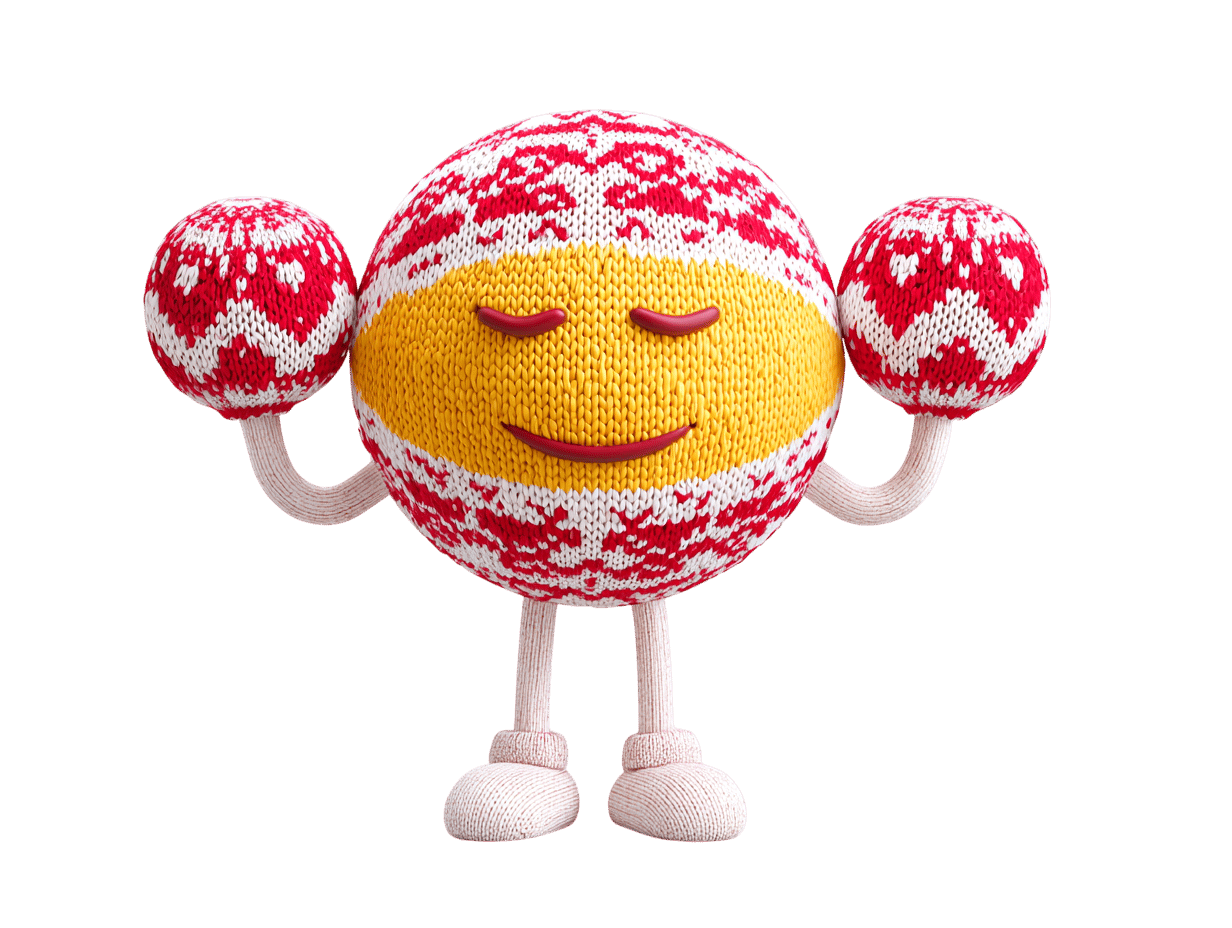 Smiling cartoon character with knitted texture and ornaments