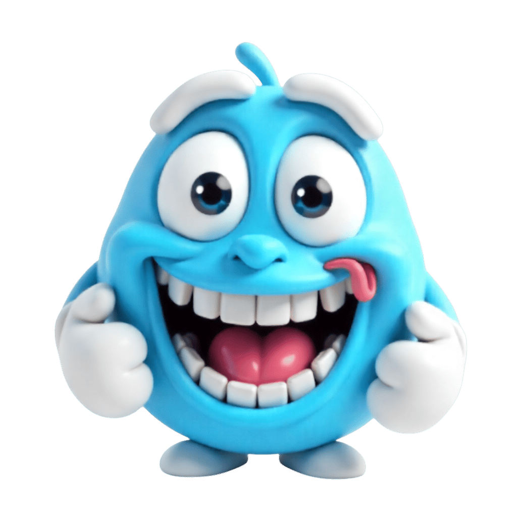 Happy blue cartoon character with a big smile and tongue