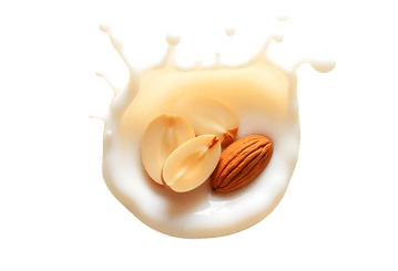 Almond milk splash with nuts on black background